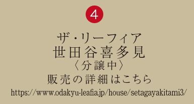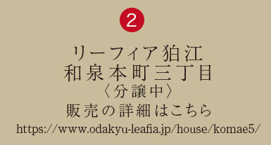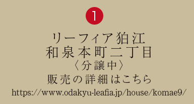 「リーフィア喜多見〈ゲートテラス〉」は都心への快適なアクセス性を誇る、小田急小田原線準急停車「狛江」駅・「喜多見」駅が最寄りの新築分譲戸建てです。小学校徒歩6分、中学校徒歩5分と教育環境が身近な立地に、家族の多様なライフスタイルに応える「次世代基準」の住まいをご用意。狛江市で新築分譲一戸建てをご検討される際にはぜひ「リーフィア喜多見〈ゲートテラス〉」をご検討ください。