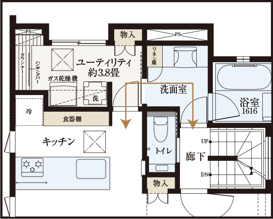 働くユーティリティ(No.6)ガス乾燥機を設え、“洗う”“乾かす”“干す”“畳む”を一つの部屋で完結できます。