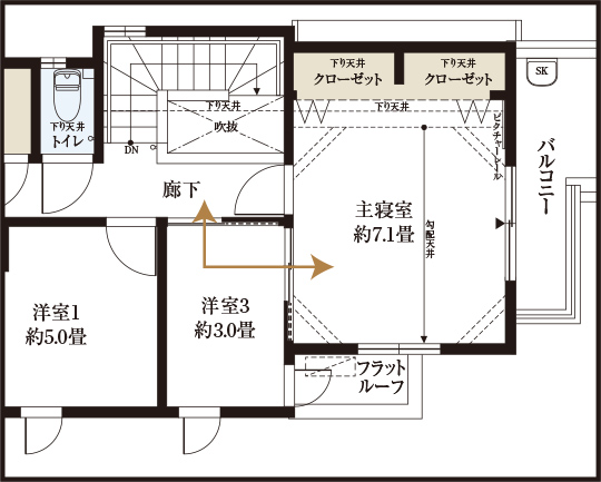 吹抜けや勾配天井を活かし、立体的な広がりを実現。