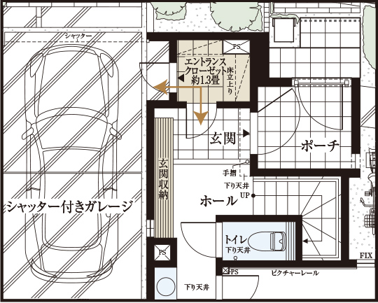 ガレージと玄関につながる