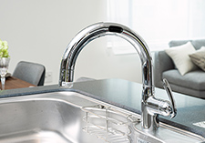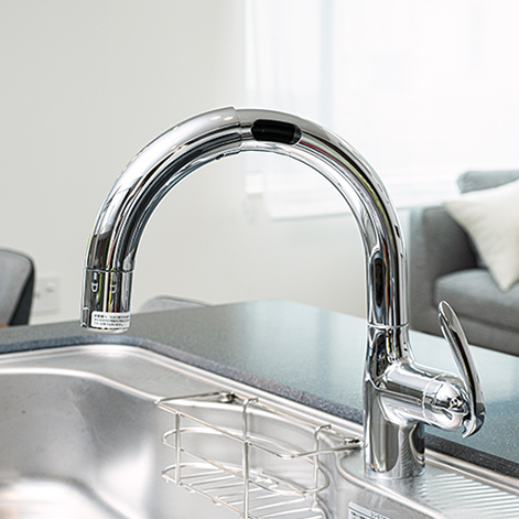 キッチンと洗面所の水栓はタッチレス式を採用。手が汚れていても触れずに使えるため清潔。また、こまめに水を止められるので節水にもなります。