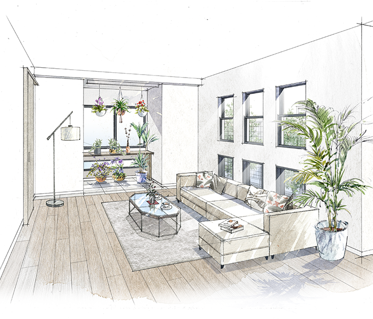 LDKに隣接した陽だまりスペース。天井を下げたお籠り感のある空間は、ガーデニングや読書を愉しむなど、家族の気配を身近に感じながら落ち着いた時間を過ごせます。