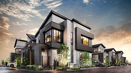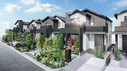 車の出入りがしやすく、開放感のあるアプローチにはインターロッキング舗装を採用し、上質で洗練された印象を演出しました。その先には、切妻屋根や勾配天井の美しいシルエットとモールのあしらいを活かした統一感のある景観が広がります。重厚感を備えた3つの邸宅が、都会的で気品ある佇まいを感じさせます。