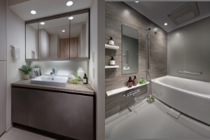 ※H1type/掲載の写真はモデルルーム(H1タイプ308号室(分譲済み)<color type:Calm Breeze>)を撮影(2024年7月)したもので、エアコン・アクセントクロス・照明・装飾用小物等オプション(有償)も含まれております。また、家具・調度品等は販売価額に含まれておりません。住戸により一部仕様が異なります。