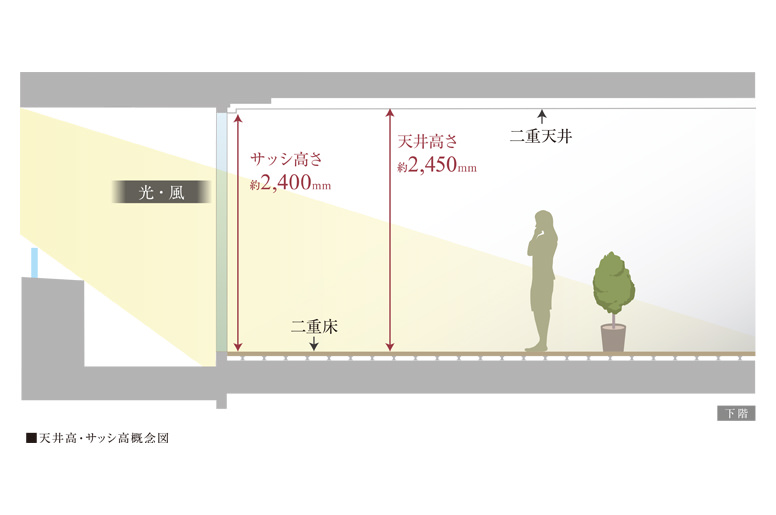 天井高を約2,450mm、サッシ高を約2,400mmを確保。ゆとりの広がりを感じられる空間を実現しています。