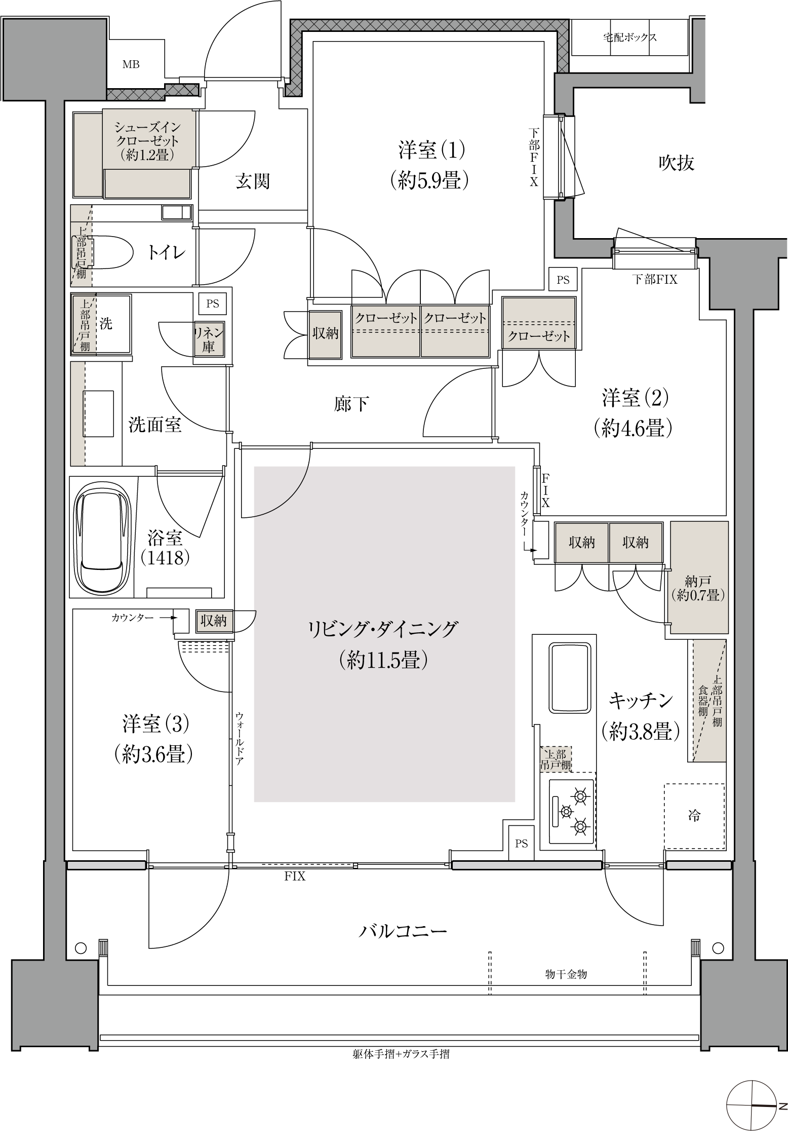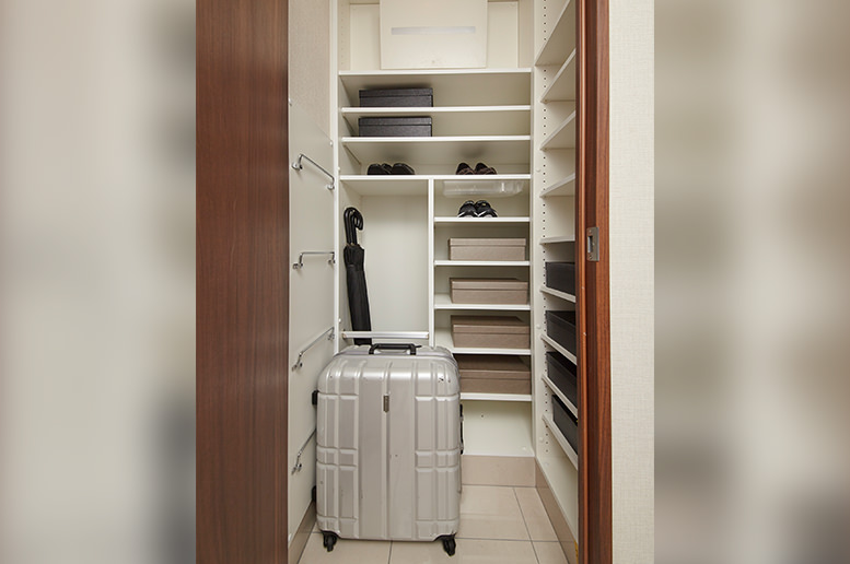 全住戸のうち約92.4%(119戸中110戸)に採用。靴類だけでなくゴルフバッグやベビーカーなどが収納できます。