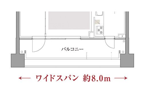 バルコニー面の開口部を約8.0m確保。居住空間に陽光と風を導き、伸びやかな開放感をもたらします。