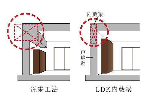 戸境壁の強度を保ちながら梁を内蔵。室内に梁型が出にくい、すっきりとした居住空間を叶えます。