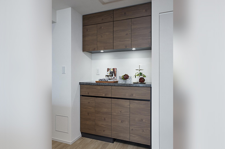 食器や調理器具が収納できるカップボードを標準装備。統一されたコーディネイトで端正なキッチン空間を叶えます。