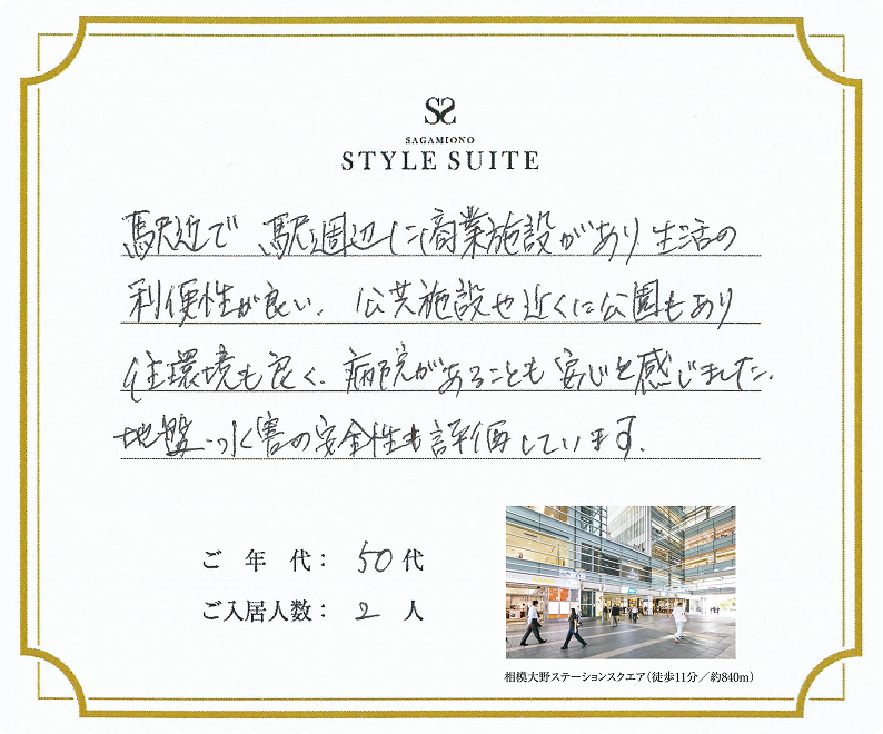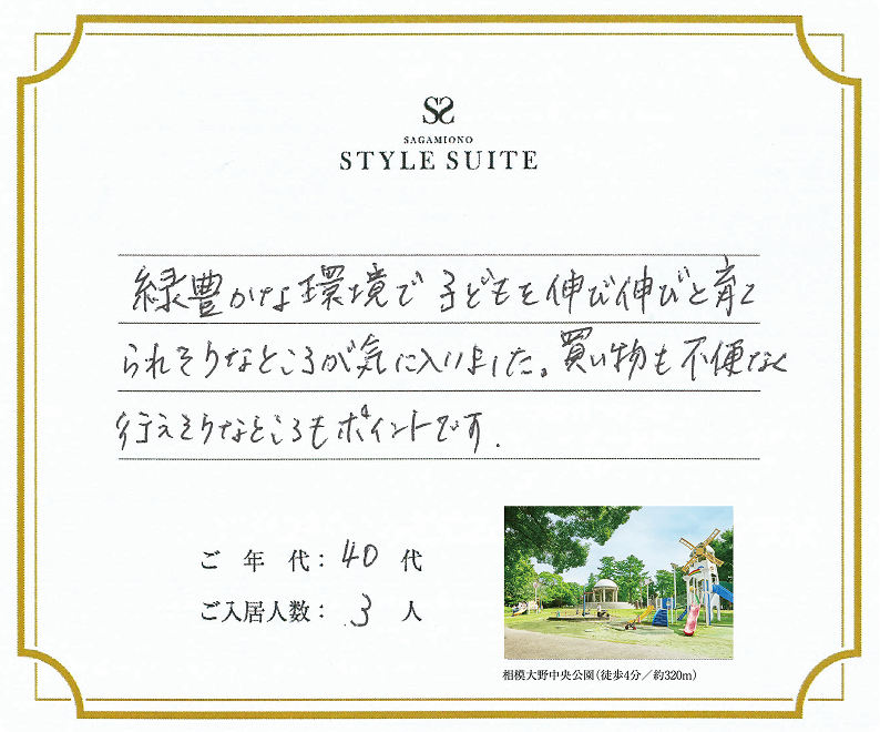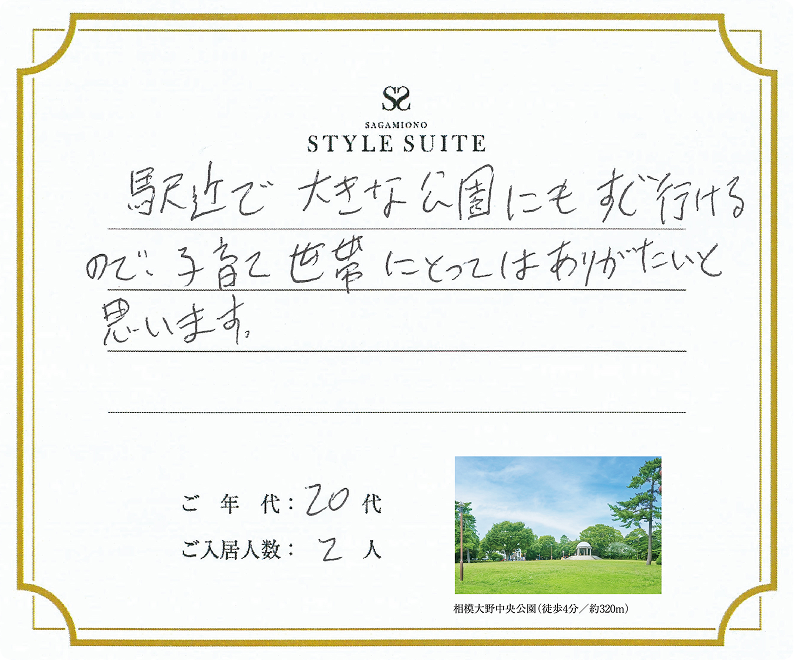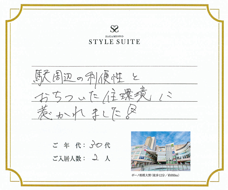 相模大野中央公園まで徒歩4分。相模大野二丁目の落ち着いた住宅街にあり、自然のやすらぎと駅の利便性を享受できる物件です。大きな公園、教育施設、公共施設が身近にあり、子育て環境が整っている点もご評価いただいております。
