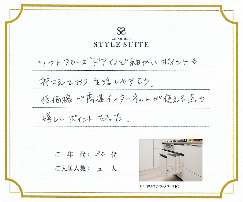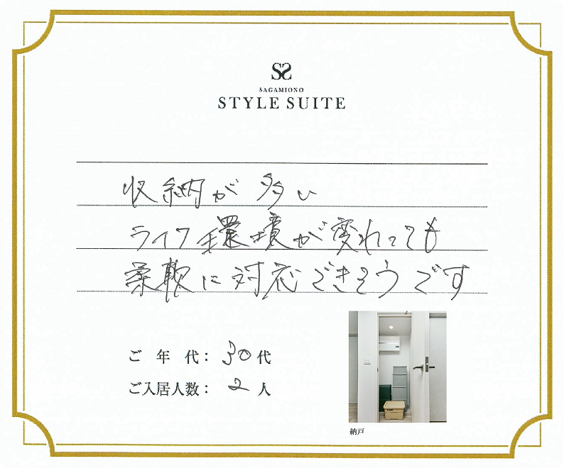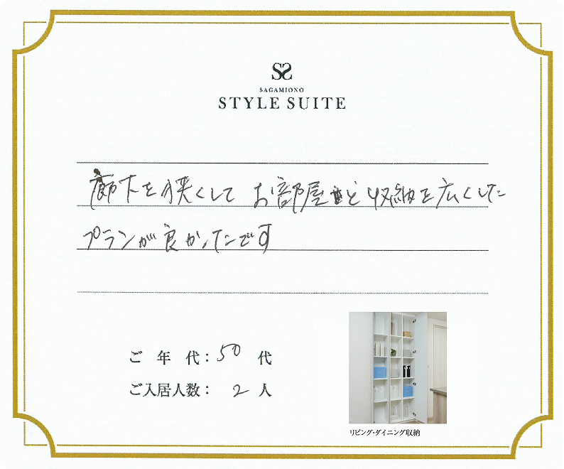収納の充実と収納率の高さ、実際の面積より広く感じられる点など、ご評価いただいております。用途によって使い分けられる玄関収納、可変性のあるウォールドアやスライドドアなど、家族構成やライフスタイルに応じてお住まいいただけるプラン も魅力です。